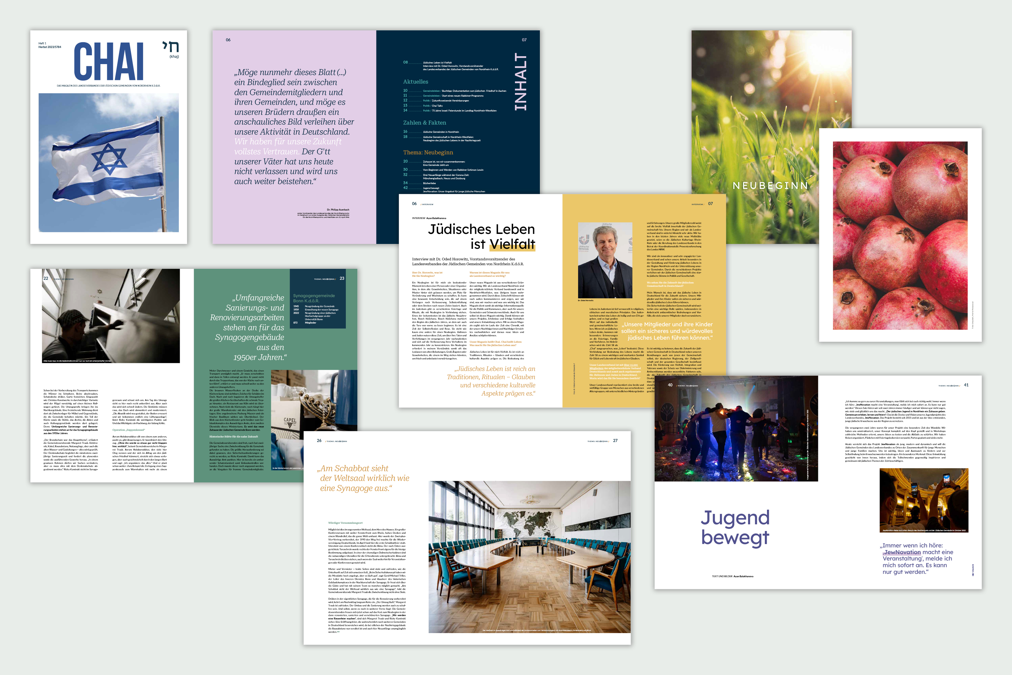 Angefangen mit der inhaltlichen Arbeit im Frühjahr 2023 fiel der Redaktionsschluss unseres Magazins kurz vor die Zeit des bestialischen Anschlags der Hamas auf Israel am 7. Oktober 2023. Seit diesem Tag ist für die jüdische Gemeinschaft weltweit nichts mehr so wie es war. Auch die Produktion des Magazins haben wir für zwei Wochen erst einmal gestoppt. Angesichts der grausamen Terrorakte der Hamas war offensichtlich, dass wir nicht einfach weitermachen können wie bisher. Wir haben uns dann jedoch entschieden, das Chai Magazin ohne größere Veränderungen zu veröffentlichen. Denn der Name unseres neuen Magazins ist Programm: Chai heißt auf Hebräisch Leben und darüber möchten wir sprechen. Wir möchten mit unserem Magazin einen Einblick geben in das Leben der Jüdischen Gemeinden in Nordrhein. Es soll zeigen, was uns umtreibt, und wir werden und müssen weitermachen. Wir werden dem Terror, mit dem die Hamas und ihre Anhängerschaft Jüdinnen und Juden weltweit und auch hier bei uns überziehen wollen, nicht nachgeben. Wir machen weiter und wissen dabei zahlreiche Unterstützerinnen und Unterstützer aus der Zivilgesellschaft, Kirchen und Politik auf unserer Seite!